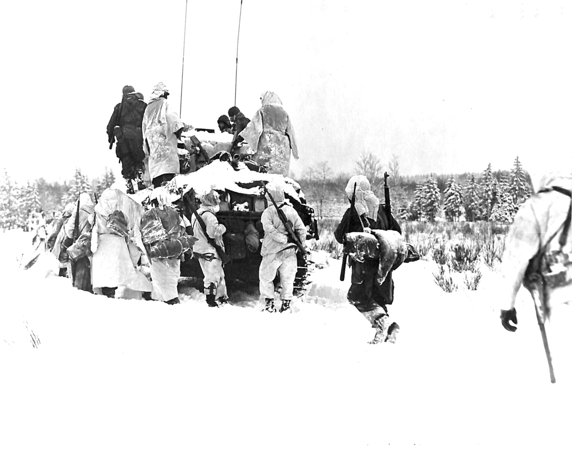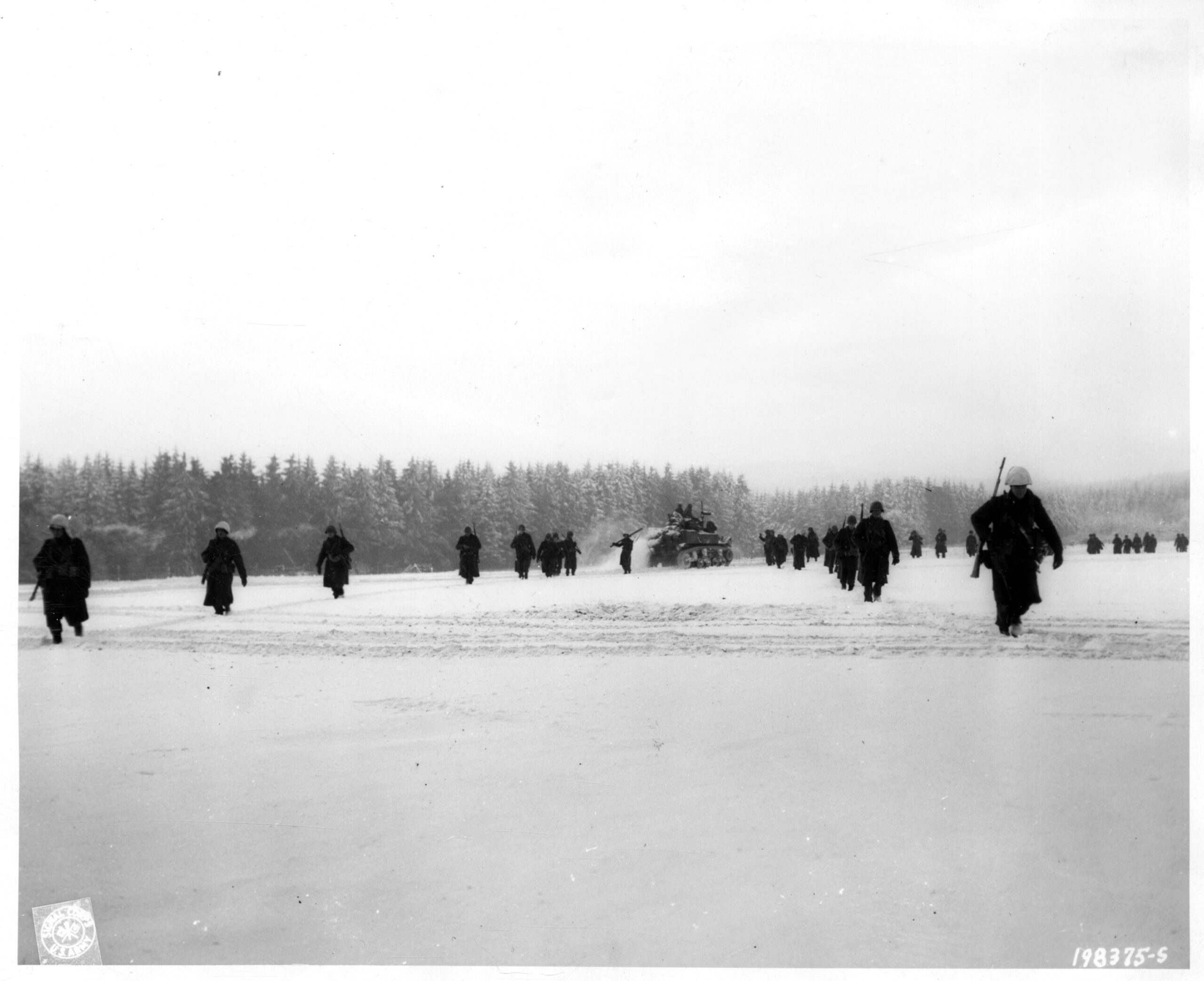 Elements of two American units move forward across a field on the outskirts of Bastogne, Belgium. 44th Armored Infantry Regiment, 6th Armored Division, December 31, 1944.