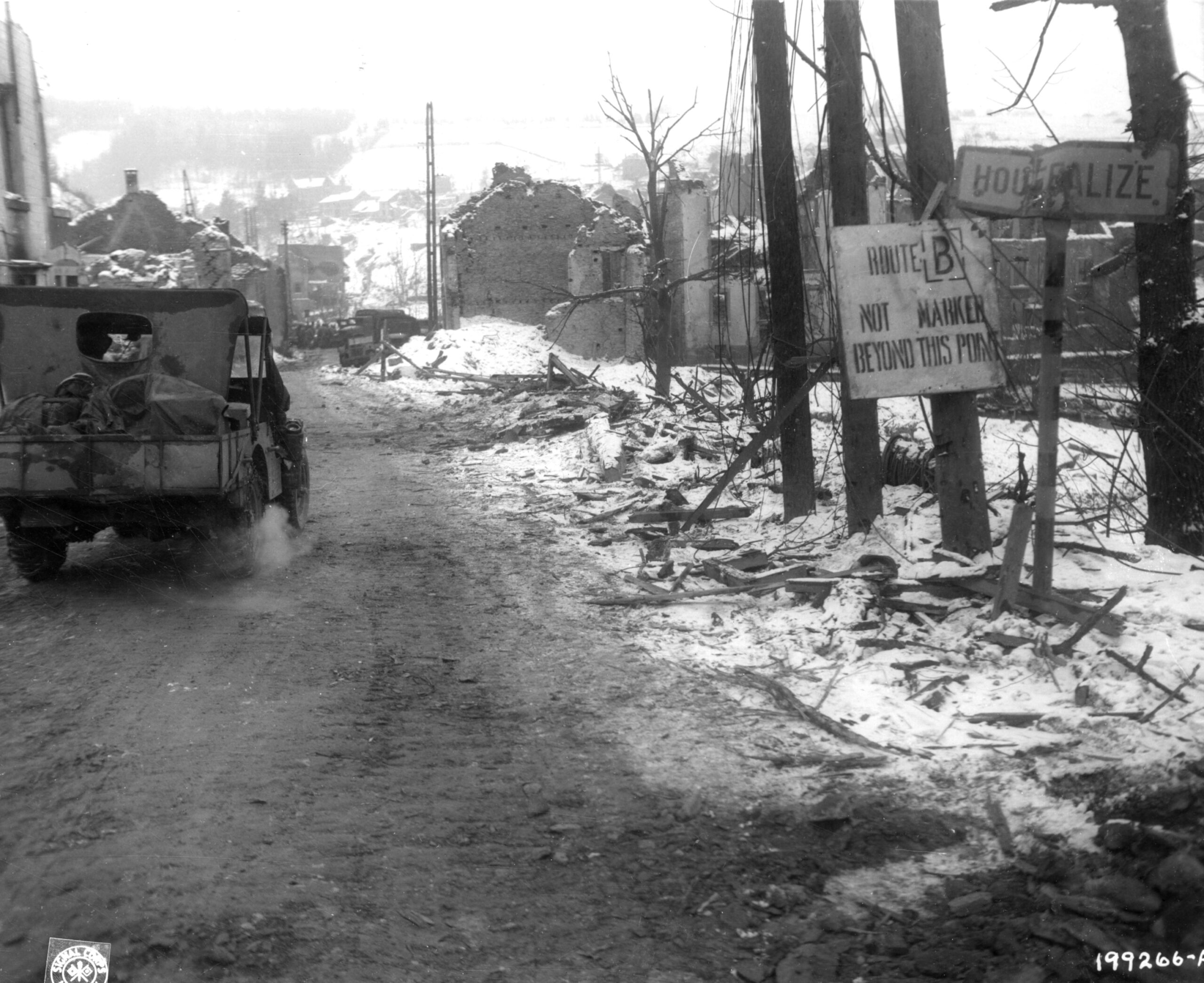An American jeep enters the shell-torn town of Houffalize, Belgium, by the main road. The town was retaken from the Germans by the 2nd Armored Division. January 18, 1945.
