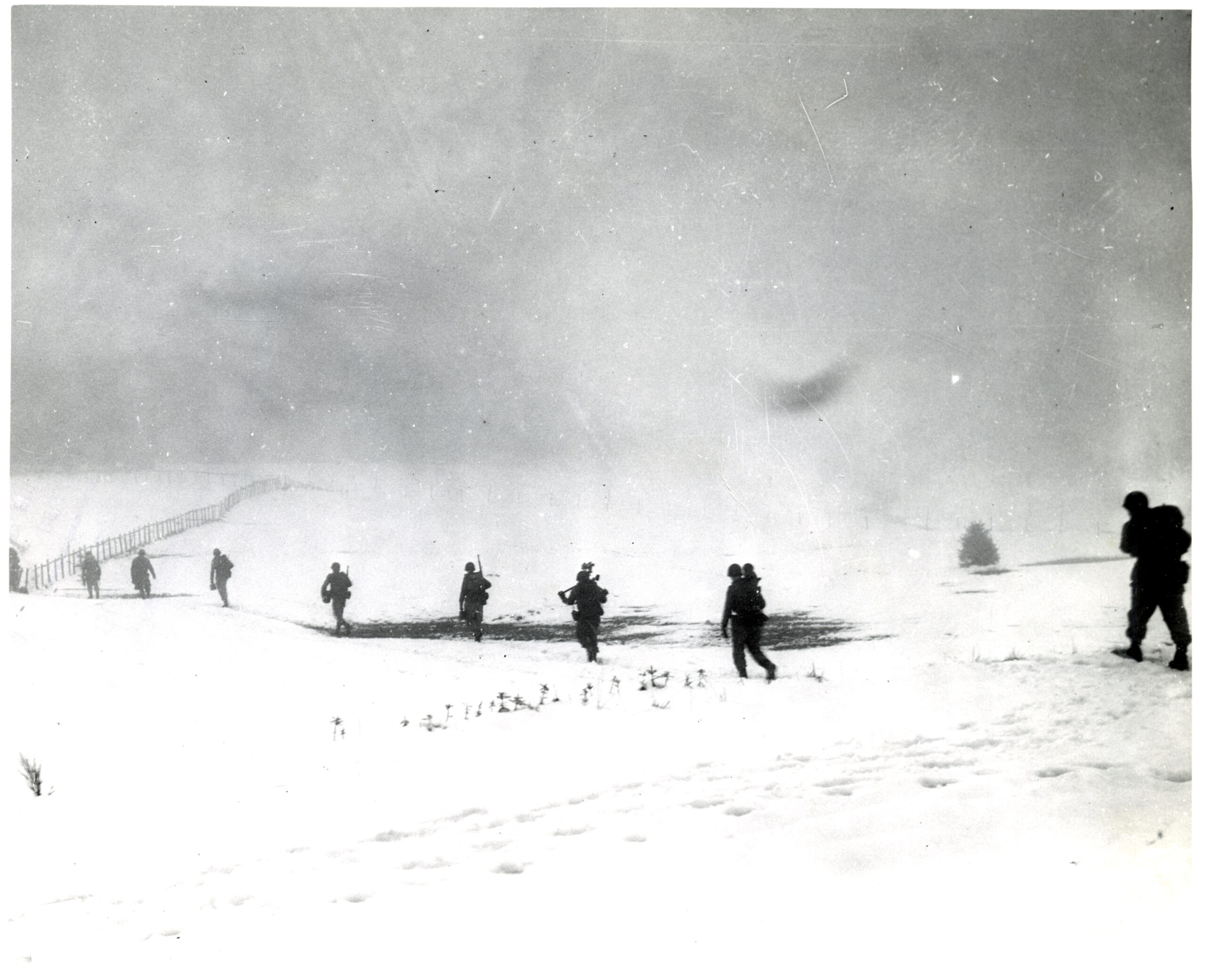 Men of the 3rd Battalion, 9th Infantry Regiment, 2nd Infantry Division, move into the mist toward their objective over a snow-covered field near the Krinkelt Forest, Belgium, December 13, 1944.