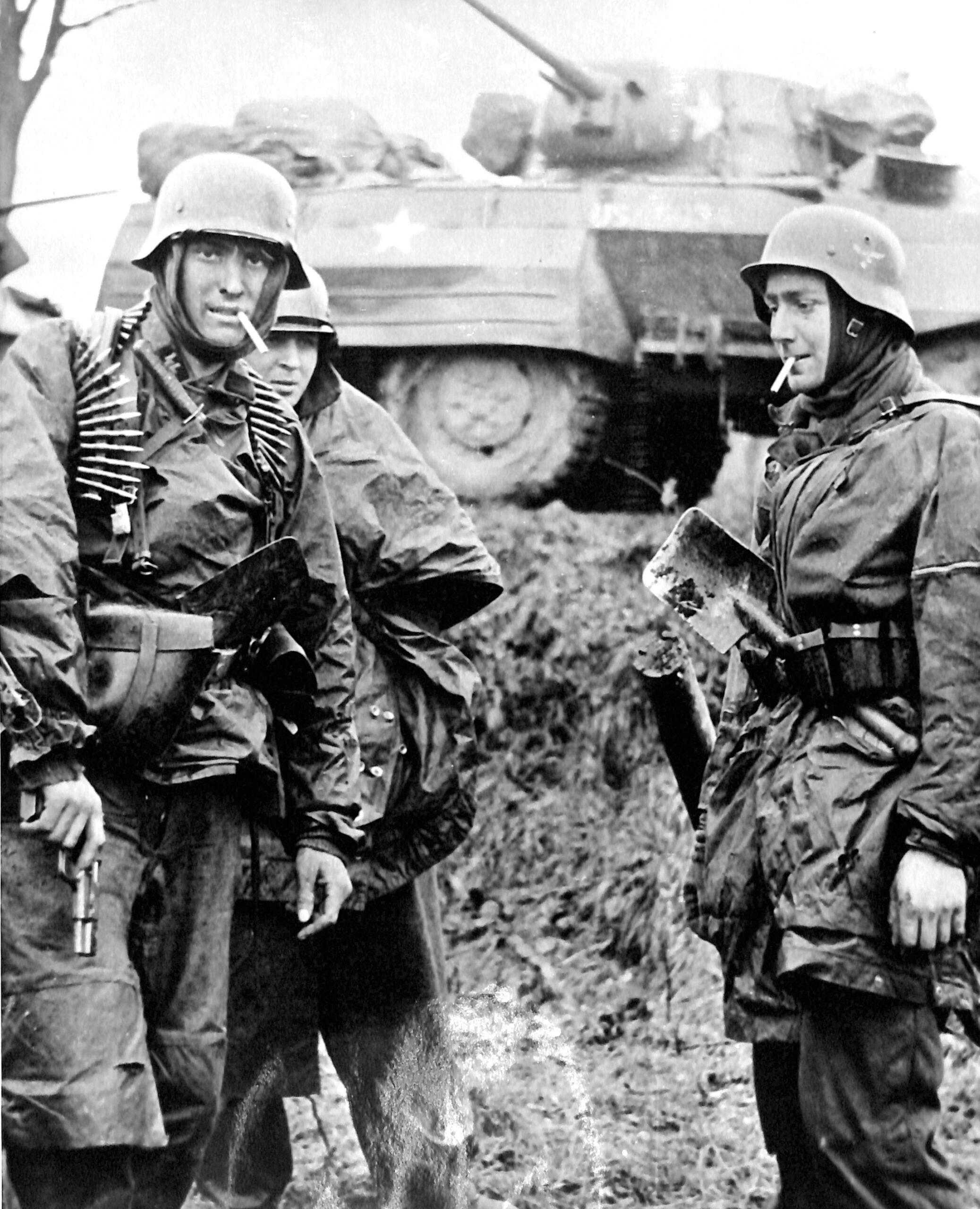 Waffen-SS troops during the nearly stage of the Winter Offensive, December 17, 1944. Note FN Browning 9-MM pistol. (Captured Photo)