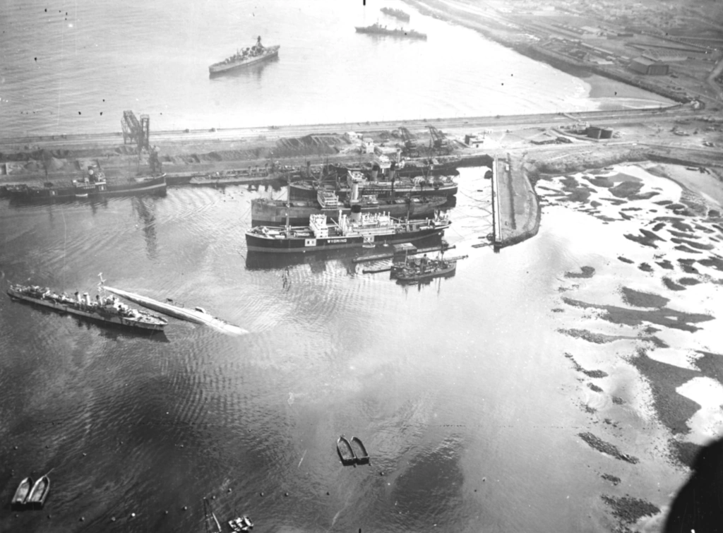 The harbor was badly damaged. There were in the outer area of the port several French destroyers and a cruiser badly burned and damaged. The French battleship Jean Bart was considerably battered, with what appeared to be 16-inch shell or air bomb hits in the bow and stern, although its own 16-inch guns did not appear to be damaged. In addition to the disabled naval vessels, there were many battered civilian ships, some of which were overturned. The warehouses and roads all gave grim evidence of the heavy bombardment which they had received from our naval air and surface ships.
