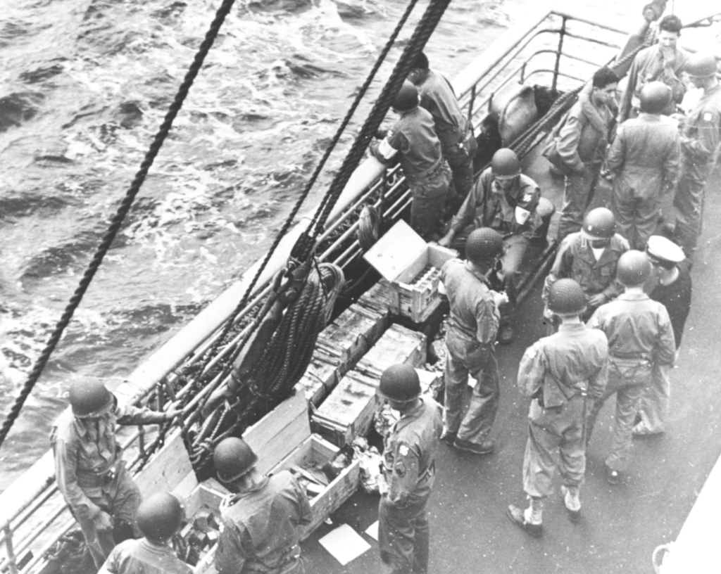 The Armored Team of the Brushwood Task Force was ordered ashore on Sunday, November 8-9 and were supposed to be landed at one beach. Vehicles and personnel were put ashore on then night of November 8-9. The various vehicles of the team were landed at three separate beaches and had to be collected into a unit during the night. At about 1300, November 9, the transport USS Arcturus (AKA-1) carrying a large portion of the armored team, docked in the Fedala harbor and unloaded at that point. During the night of November 9-10, the entire team with the exception of a maintenance platoon and an engineer platoon were ashore and placed in division reserve. The armored team lost only one half-track during the unloading.