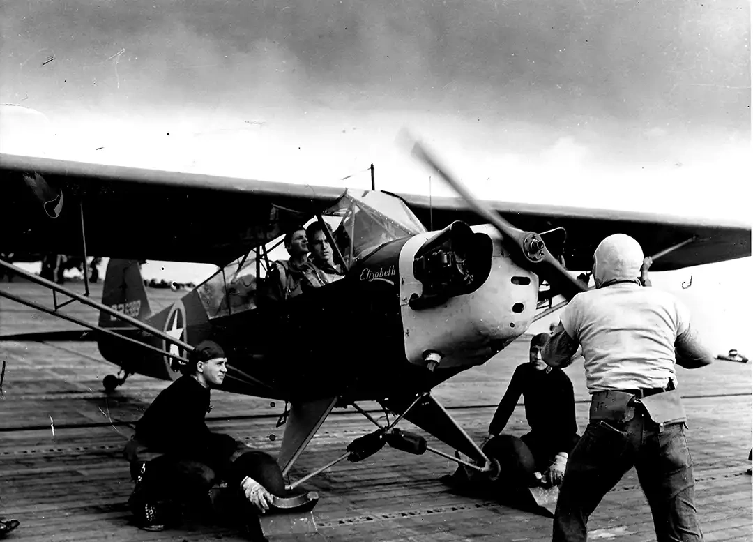 No use was made of the artillery Piper Cub planes. Three of these planes accompanied the force and were carried on the aircraft carrier USS Ranger (CV-4). When a suitable landing field was found for them during the afternoon of November 9, the planes took off from the carrier for shore. While flying over the transports, a destroyer opened fire upon them and they dispersed in various directions. One of the planes, unfortunately, came down low over our own troops and appeared just after a French plane passed, strafing our forces. Our ground troops immediately opened fire upon the Cub plane and seriously injured the pilot. The plane fell and Capt Alcorn, the pilot, was pulled out prior to the time that it burned. He was later evacuated to the Ranger with several small arms bullets in one of his legs. The other two pilots were successful in evading the ground troops and landed at the assigned field.